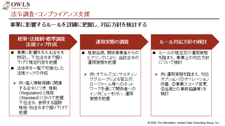 オウルズコンサルティンググループでは、事業に影響を与える法令を特定し、下位法令を含めた法体系を一覧で可視化した「法規マップ(ルールマップ)」を作成します。その上で、独自のネットワークによる規制当局や関係事業者等からのヒアリング等を通じて、当該法令・法規等の運用実態の調査を行います。これらのインプットを踏まえて、当該法令・ルール等への対応方針の検討を全面的にご支援します。