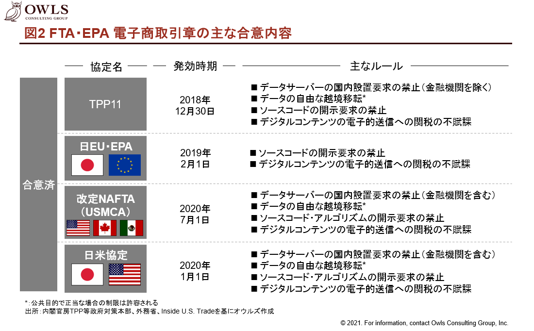 このような動きは、企業のイノベーションを阻害し、消費者の利便性を低下させる危険性を含んでいる。これまで、モノやサービスの貿易取引の自由化を推進してきた通商ルールでは、データ取引のようなデジタル貿易に有効な規定が十分に整備されてこなかった。最近ようやく、TPP11、日EU・EPA、改定後のNAFTA(USMCA)等の大型の地域間協定でデジタル貿易の促進にかかる規定が合意され始めている。